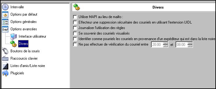 Si cette case est cochée, PopTray n'effectuera pas de vérification de courriel entre les heures indiquées. Utile, entre autres, pour ne pas être dérangé par un signal sonore au cours d'une période donnée. |