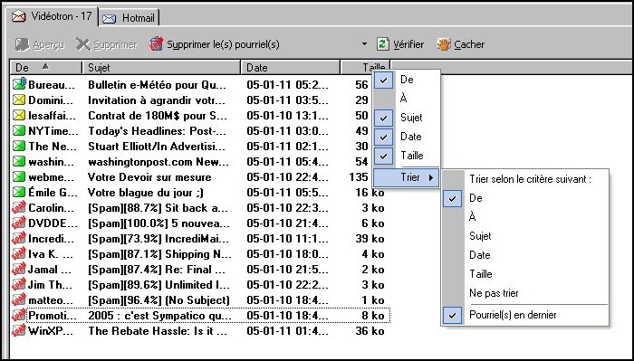 Maintenant, revoyons la même fenêtre avec plusieurs courriels. Au-dessus de ces courriels apparaît une barre contenant les noms des divers éléments d'un courriel. Positionnez le curseur de votre souris sur un de ces éléments et cliquez sur le bouton de droite. Une petite fenêtre s'ouvre. Descendez jusqu'au mot Trier et cliquez une fois. Vous aurez la fenêtre suivante.
