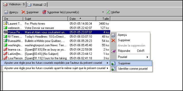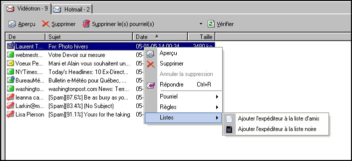 Notez ici que l'icône enveloppe peut être de diverses couleurs et que, parfois, un trombone y est attaché : une enveloppe verte indique que l'expéditeur est dans Liste blanche, une enveloppe jaune indique que l'expéditeur n'est pas dans la Liste d'amis, le mot Spam inscrit sur l'enveloppe indique qu'il s'agit d'un pourriel et, enfin, le trombone indique qu'un fichier est joint à ce courriel. ![]() Ajouts automatiques aux listes et création automatique de règles