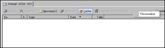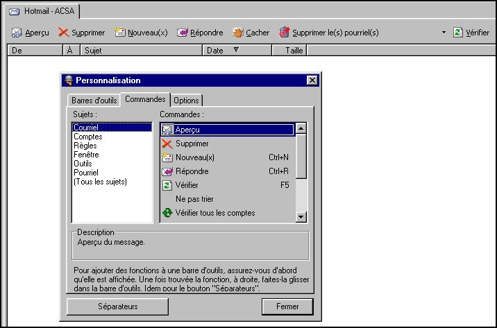 Pour personnaliser une barre d'outils, ouvrez d'abord la fenêtre que vous voulez personnaliser puis placez le curseur de la souris à l'intérieur de la barre et cliquez avec le bouton droit de la souris. Vous obtenez la petite fenêtre suivante : ![]() Vous cliquez à l'intérieur de la petite fenêtre Personnaliser qui vient de s'ouvrir et la fenêtre de dialogue suivante apparaît :
