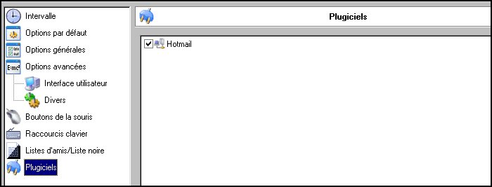 Dans la fenêtre Plugiciels, une icône doit apparaître suivie du mot Hotmail. Cochez la petite case placée devant l'icône puis cliquez sur le bouton Enregistrer en bas. Si l'icône et le mot Hotmail n'apparaissent pas, c'est que le plugiciel n'a pas bien été installé. |