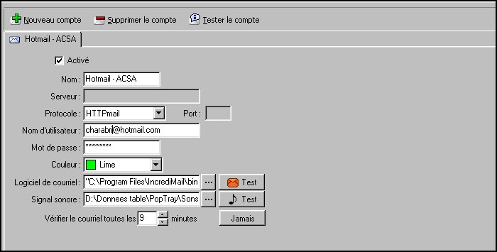 Pour le son qui indiquera l'arrivée de courrier, vous pouvez utiliser un des sons fournis avec PopTray dans le sous-répertoire Sounds. Vous pouvez aussi utiliser n'importe lequel fichier WAV qui se trouve dans votre système, le copier dans le sous-répertoire Sounds, etc. Cliquer sur le bouton Tester le compte afin de vérifier si tout fonctionne bien. |