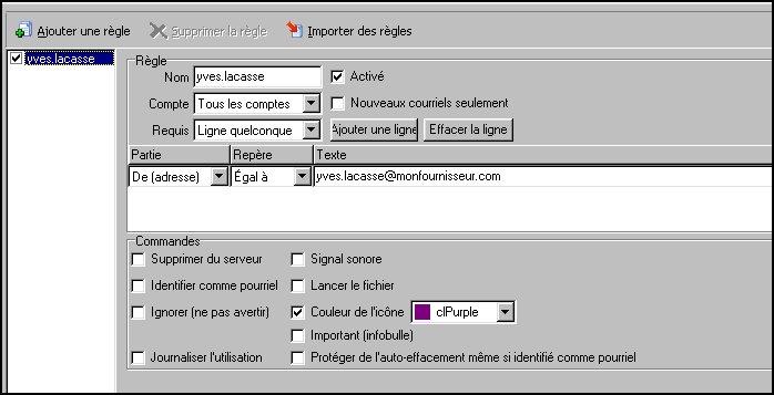 Créons une première règle en utilisant une adresse de courriel. Pour ce faire, supposons que je désire qu'une icône de couleur pourpre apparaisse dans la zone de notification lorsque je reçois un courriel de cette adresse. Voici les paramètres de la règle :