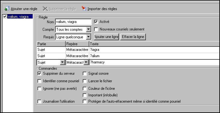 Créons maintenant une règle qui fera en sorte qu'un courriel contenant, dans la ligne Sujet, un des mots suivants, sera supprimé du serveur : viagra, valium, pharmacy. Et puisqu'il est possible d'utiliser les métaractères dans les règles, faisons en sorte que les mots seront reconnus, qu'une majuscule ou qu'une minuscule soit utilisée pour la première lettre.